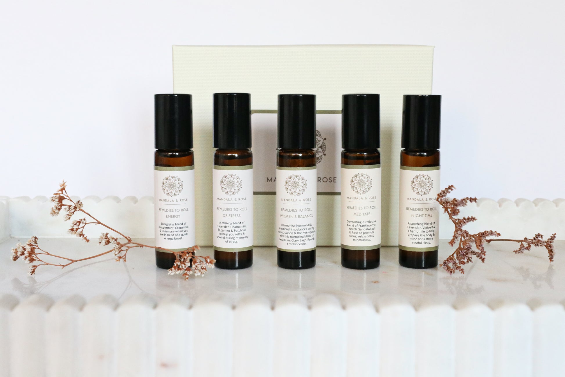 Indulge in a moment of tranquility with our Remedies To Roll Gift Collection, beautifully packaged in an elegant ivory gift box. This collection features five 10ml essential oil roll-ons, making it the perfect gift for yourself or someone special. Designed for self-care on the go, simply pop them in your pocket or handbag and apply to pulse points throughout the day for an aromatic boost.