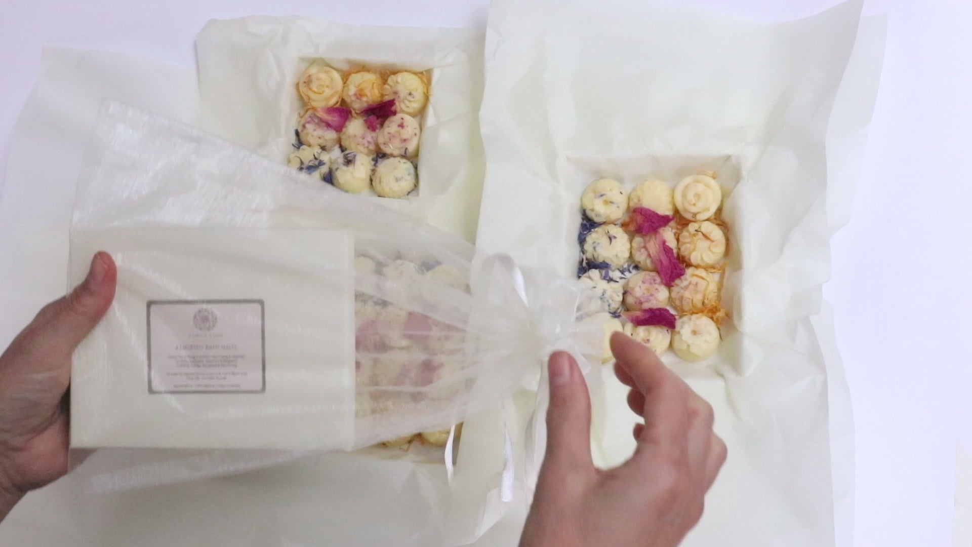 Each box contains 12 floral-shaped melts, petite at 2 cm in diameter (about half the size of our square melts), perfect for a delicate, aromatic, and moisturizing bath experience. These melts are ideal for a gentler, less oily bath while still leaving skin soft and silky.