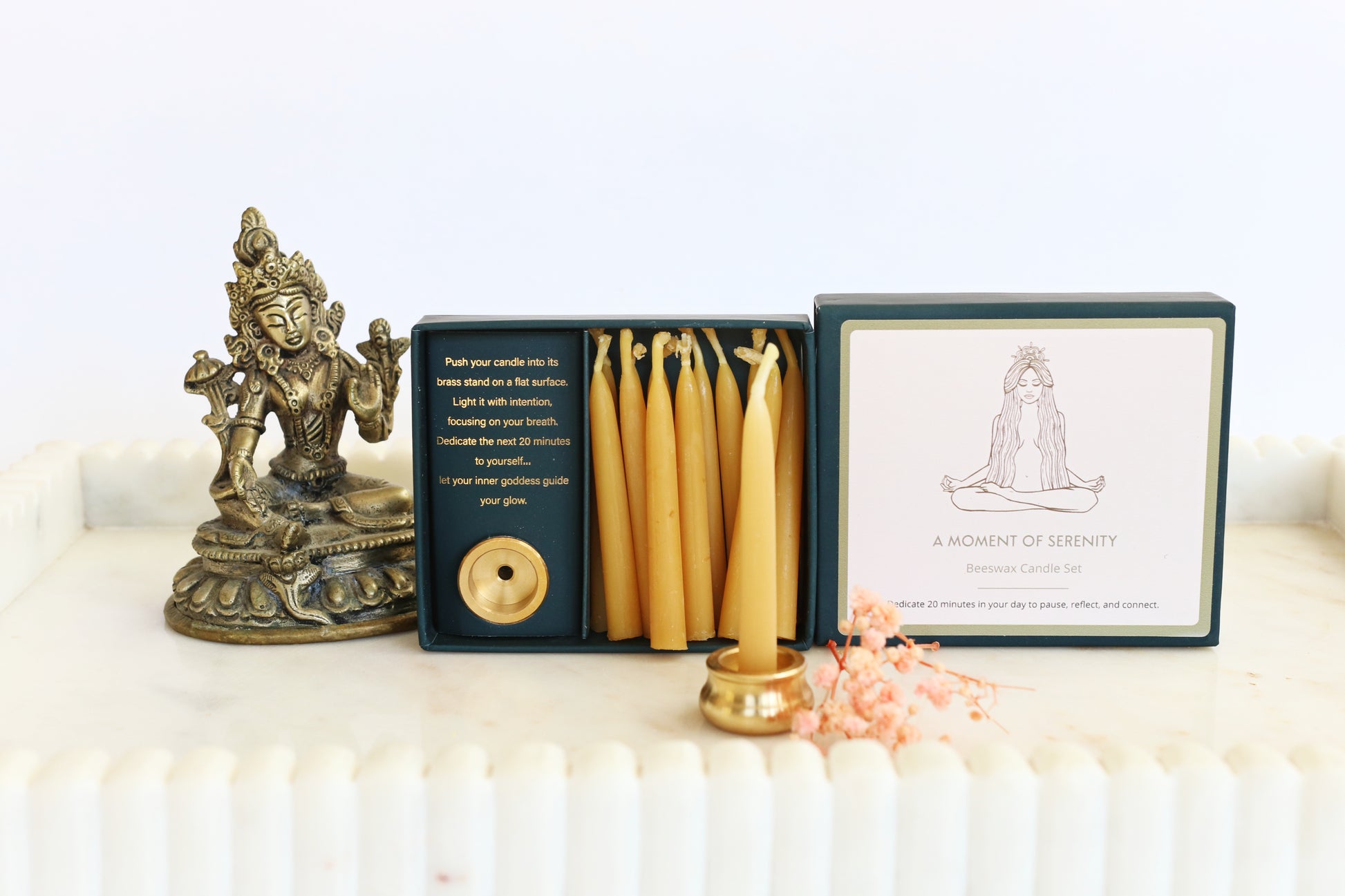 At its heart is the A Moment of Serenity beeswax candle set — twelve pure, honey-scented candles, each offering around 20 minutes of quiet light. These are your invitation to create a mindful ritual: whether journaling, meditating, or simply sitting in stillness.