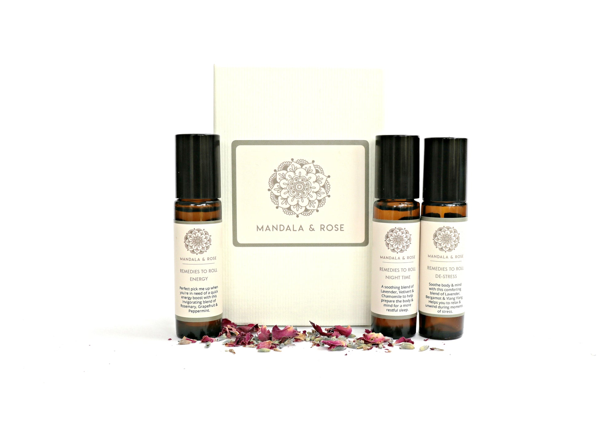 You can purchase the Energy Remedies To Roll with a fabric gift bag or as part of the ivory box gift set, 'Trio Remedies To Roll,' which includes Energy, DeStress, and Nighttime blends.