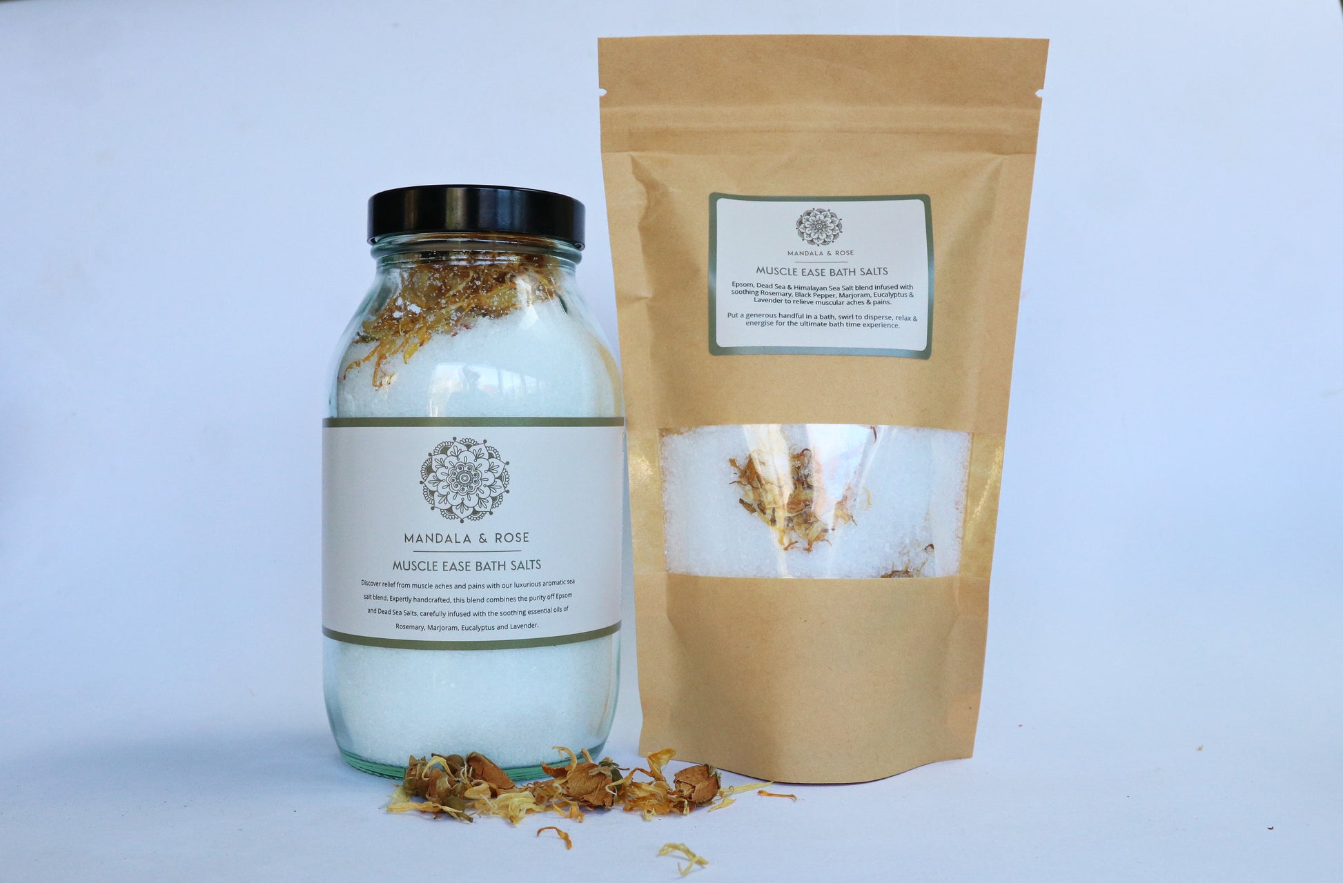 Muscle Ease Bath Salts – Epsom and Dead Sea salts enriched with Rosemary, Marjoram, Eucalyptus, and Lavender. Rich in magnesium, this blend soothes tired muscles, eases tension, and invigorates the body, leaving skin nourished and silky.