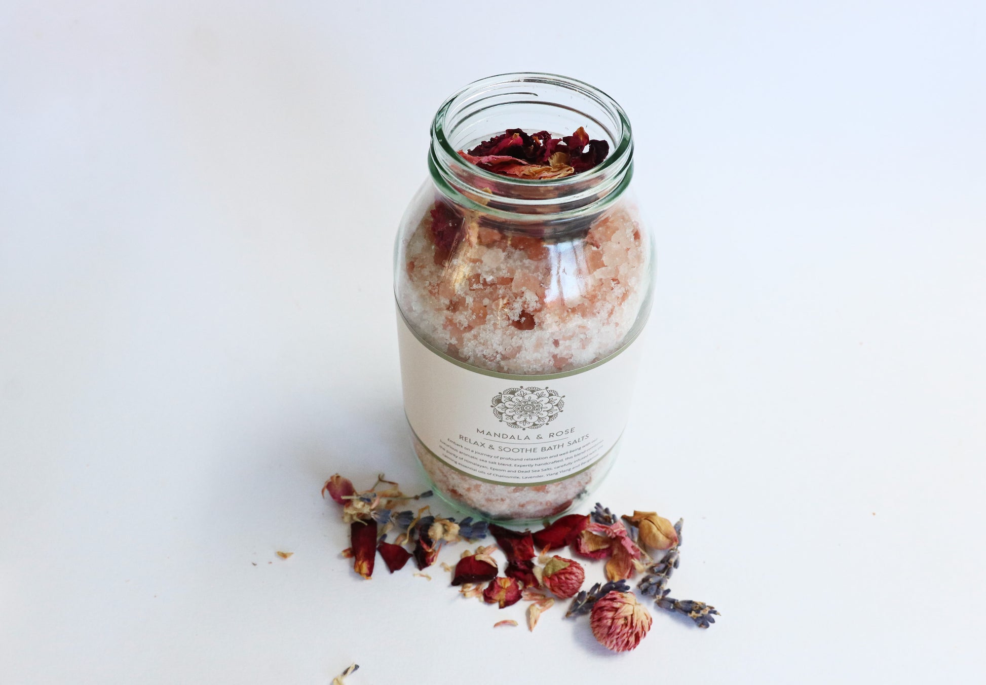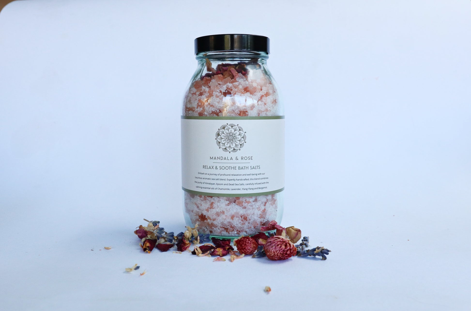 Relax Bath Salts – A mineral-rich blend of Pink Himalayan, Epsom, and Dead Sea salts, infused with Lavender, Geranium, Bergamot, and Patchouli to calm the senses, soften skin, and invite restful relaxation.