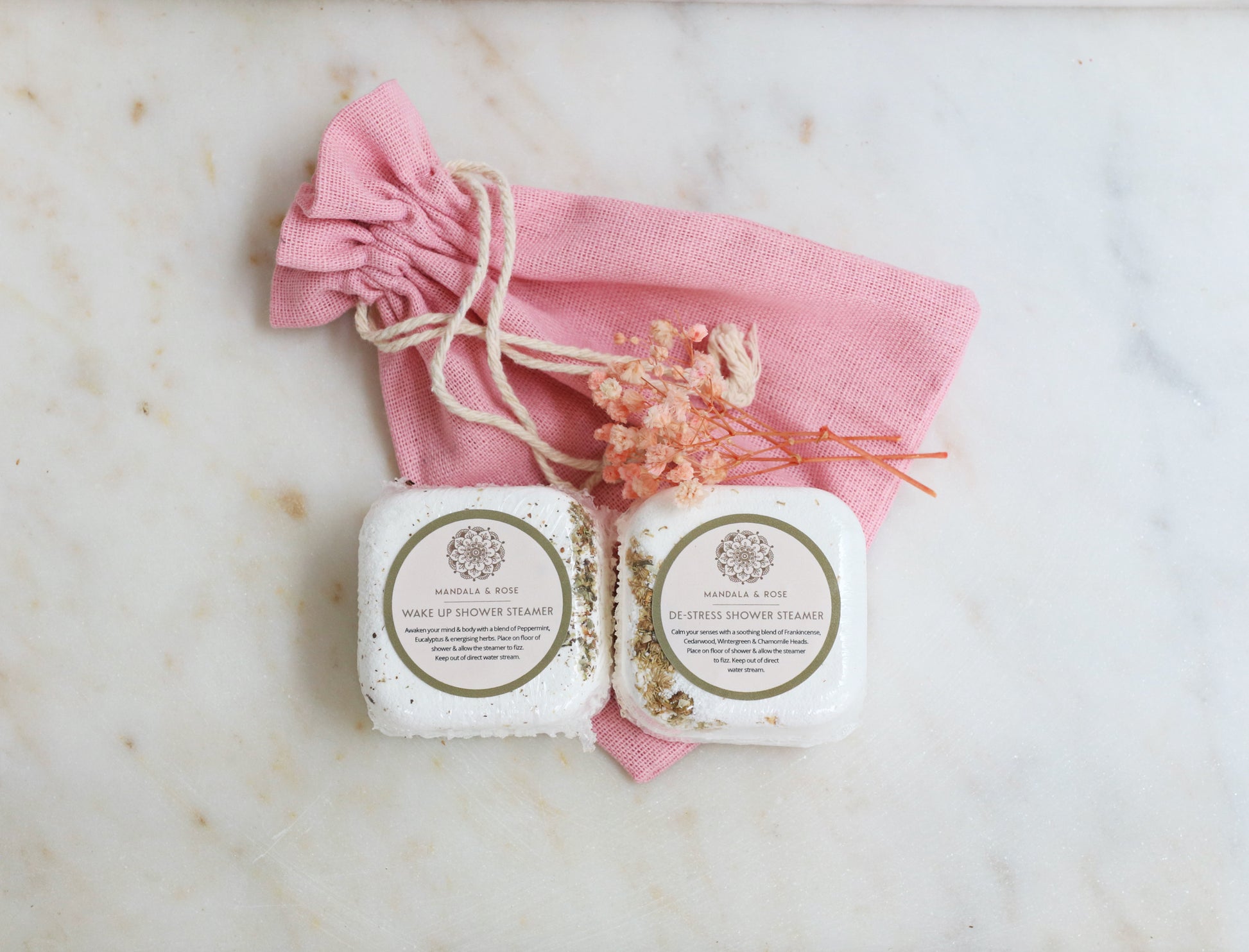 Each set includes 2 handcrafted shower steamers made with pure essential oils and natural ingredients in a fabric gift bag.