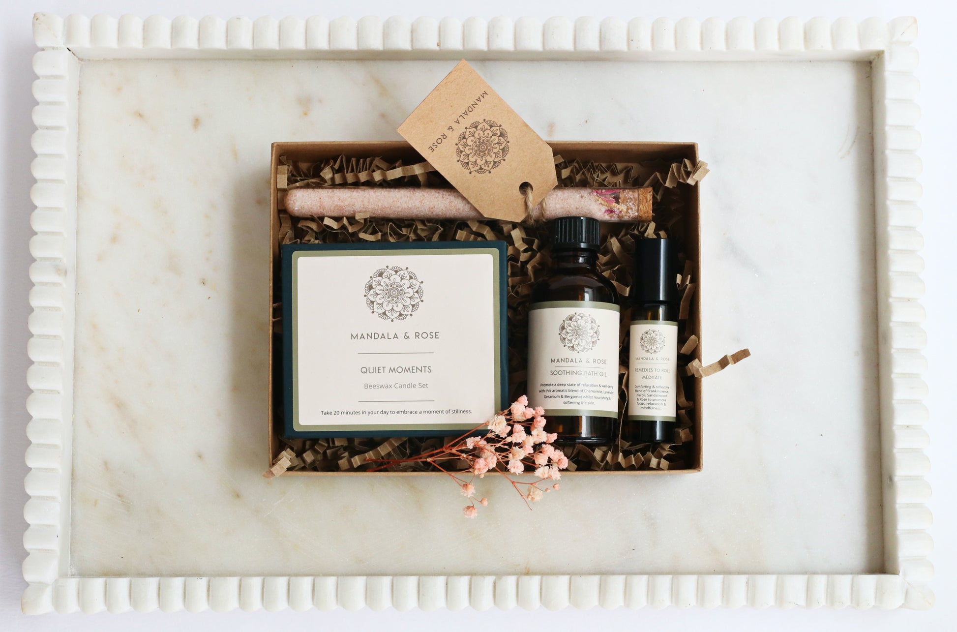 Immerse yourself in a sacred pause with A Quiet Ritual Gift Set by Mandala & Rose. This thoughtfully curated collection invites you to slow down, reconnect with yourself, and embrace moments of gentle reflection. Harmoniously blending light, scent, and skin-softening bath indulgence, it transforms everyday routines into rituals of stillness and self-care.
