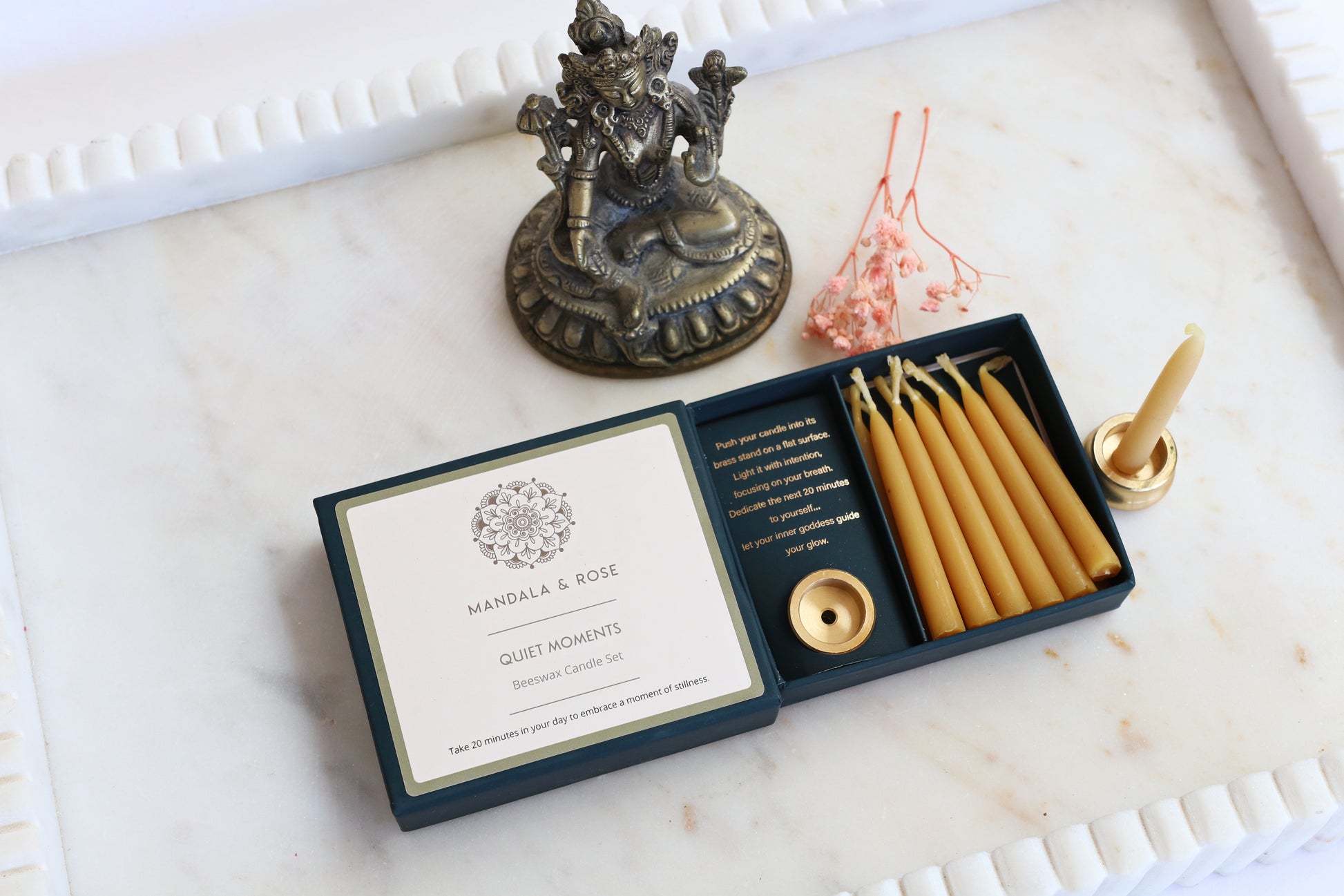 Quiet Moments Beeswax Candle Set – Twelve hand-rolled, honey-scented beeswax candles (approx. 20-minute burn each) presented in a deep teal box with a solid brass candle stand. A subtle cue for meditation, journaling, mindful baths, or simply being present.