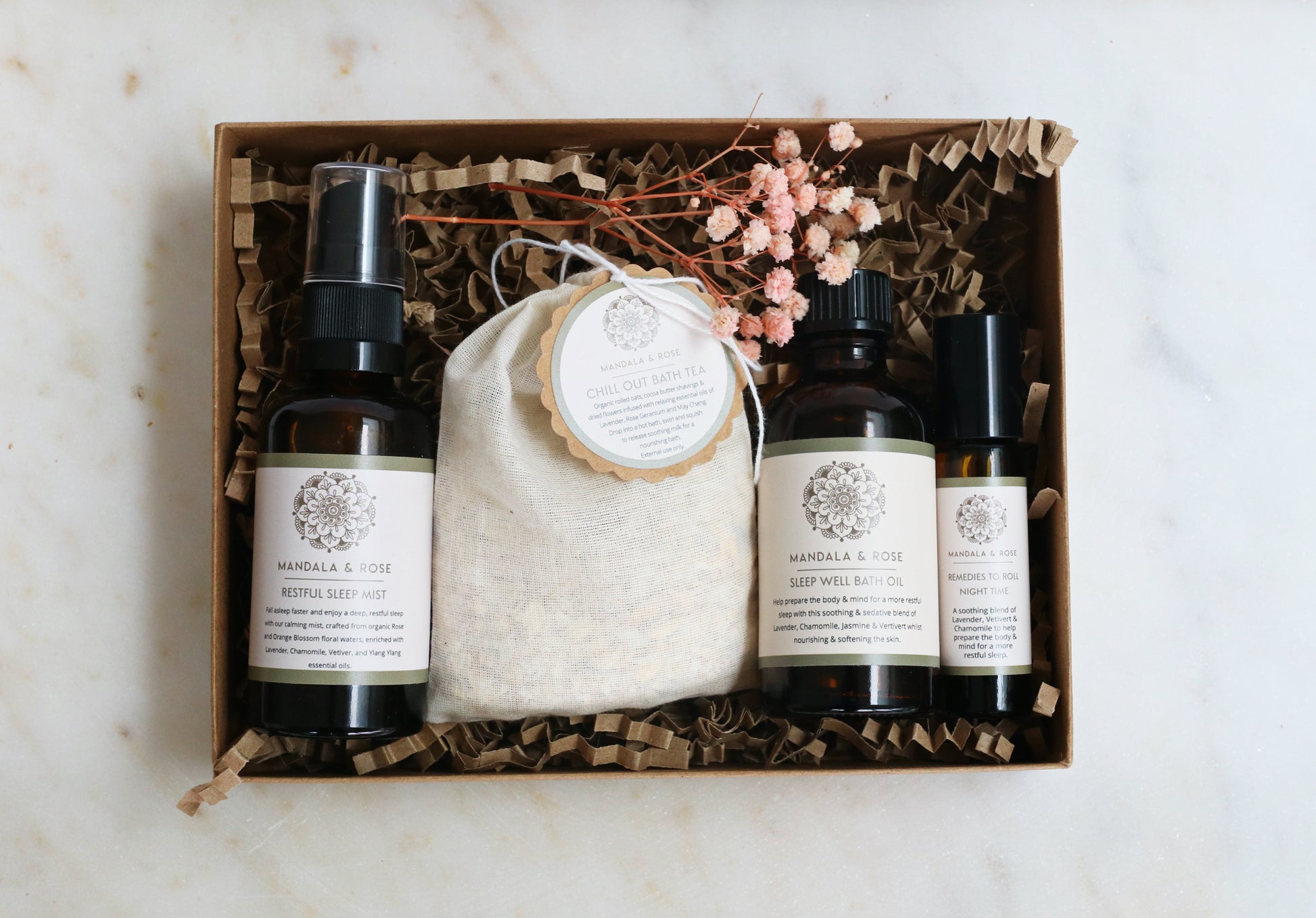 ✨ A soothing bedtime gift set with bath oil, bath tea, pillow mist & essential oil roll-on. Handcrafted to promote relaxation and a restful night’s sleep.