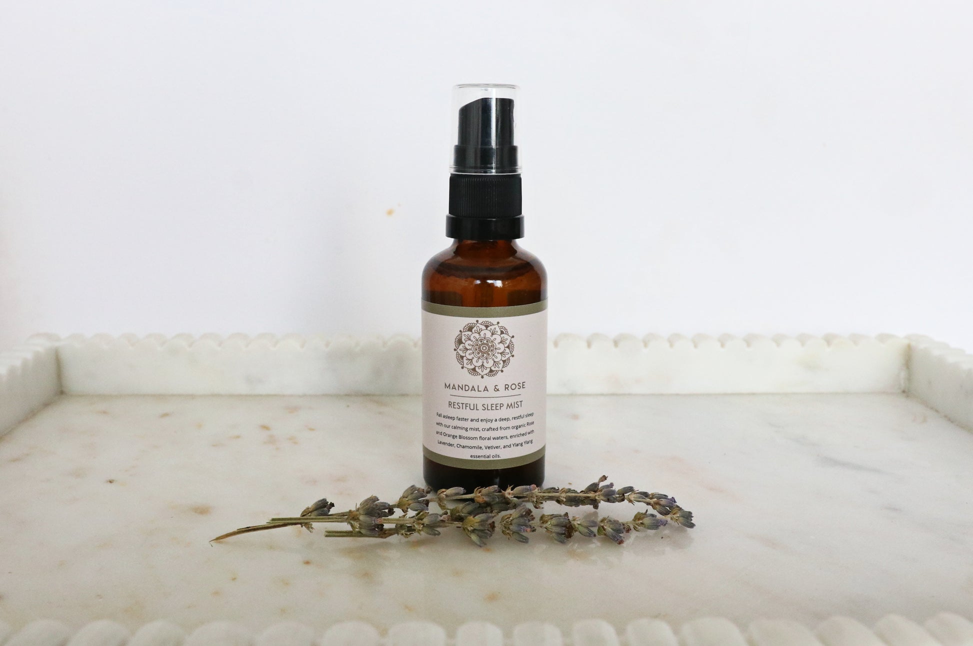 After bathing, mist your pillow, sheets, or bedroom with the Restful Sleep Pillow Mist. The floral waters and essential oils create an atmosphere of serenity.